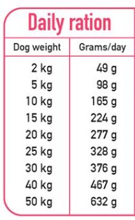 SPOSÓB UŻYCIA: Karma odpowiednia dla wszystkich ras psów. Tabela zalecanych dziennych dawek (podane ilości są orientacyjne) znajduje się na tyle opakowania. Ilość karmy może się różnić w zależności od aktywności, rasy psa i warunków środowiskowych. Psy powinny mieć zawsze czystą i świeżą wodę. Przechowywać pojemnik szczelnie zamknięty, w chłodnym, suchym i przewiewnym miejscu, z dala od światła i słońca.